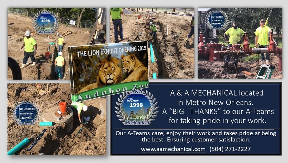 A&A Mechanical, LLC - New Orleans area: Our “A Team” Has years of Mechanical Contracting, Plumbing, HVAC experience in hospitals, hotels, high-rise commercial and residential buildings, airports, educational, power stations, refineries, restaurants, retail outlets and "health care" facilities." "Louisiana Mechanical Contractor", "Master Plumbing Boards throughout Southeast Louisiana" specializing in "Cooling Towers", "Chilled Water", "Backflow Prevent", Boilers, Valves, "Underground Plumbing", "Commercial Plumbing", BIM, CAD, "Critical Shutdowns", fully insured and licensed. Need info after hours: email: info@aamechanicalinc.com and our team will reply to emergency or critical issues.